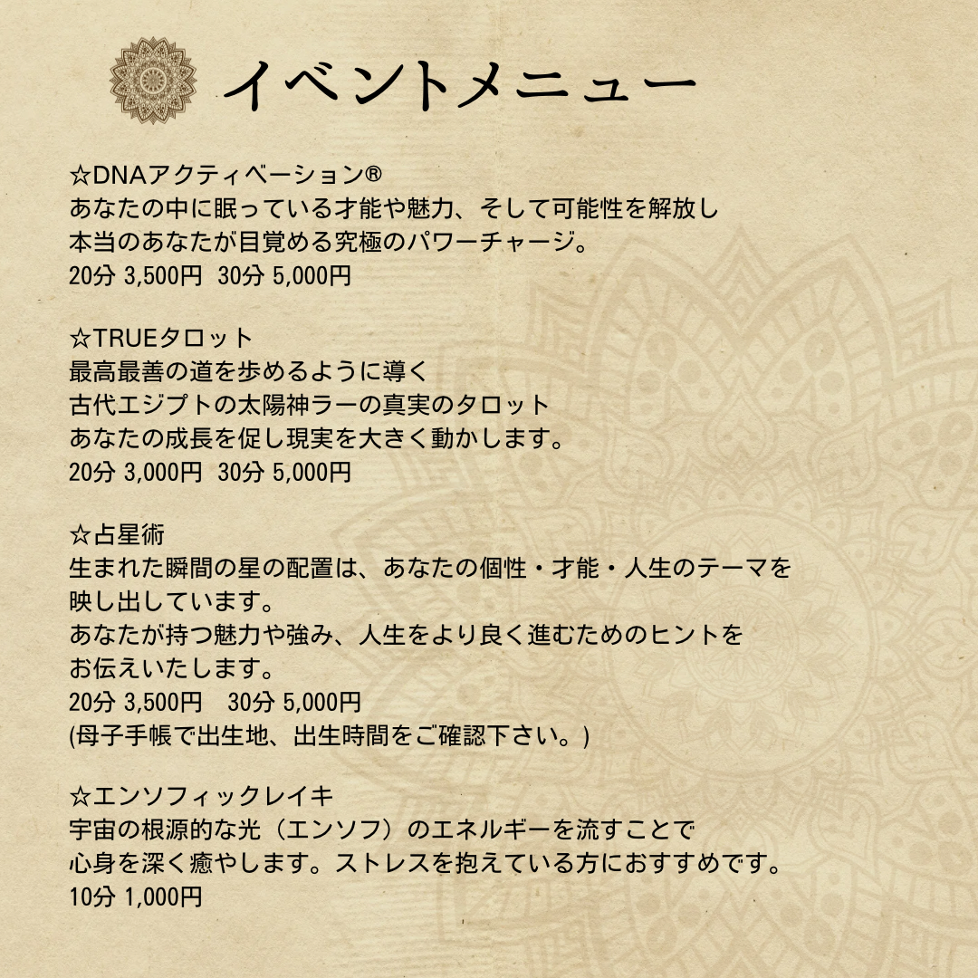 (都合により、占星術は当日ご体験頂けない場合がございます。ご希望の方は、お日にちが近くなりましたら、ご確認いただけましたら幸いです。)